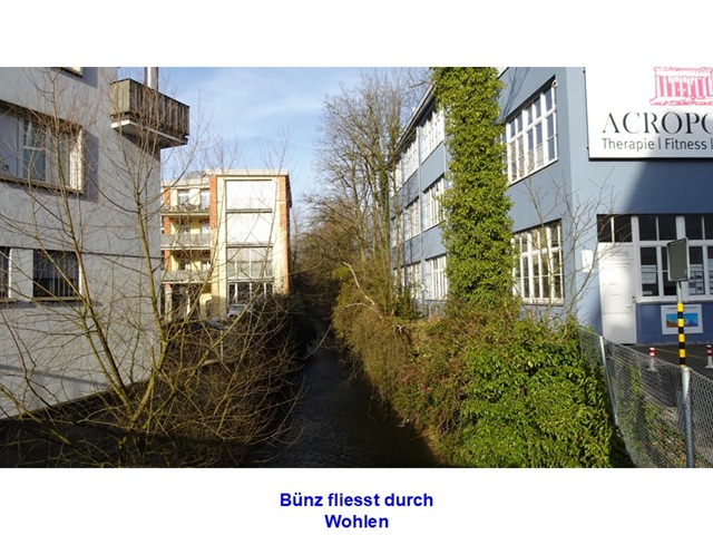 Weiter oben gegen Anglikon zu, endet der renaturierte Abschnitt und die Bünz fliesst durch ein kanalisiertes Flussbett. Anglikon ist bereits ein Vorort von Wohlen.